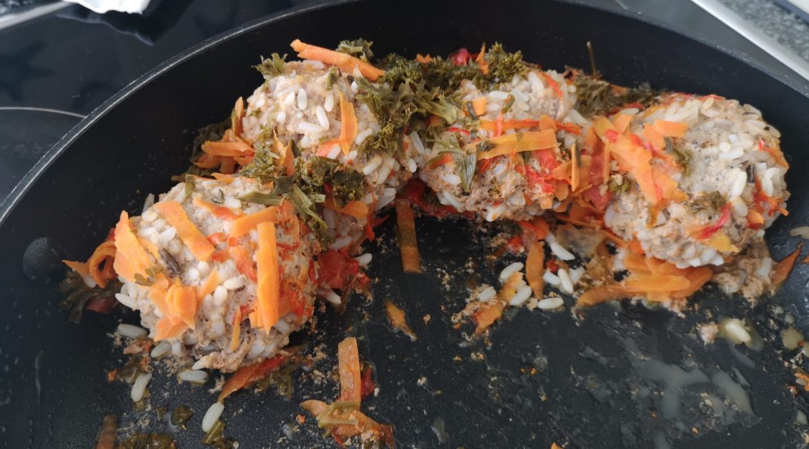- Hackfleisch in eine Schüssel geben, abgetropftem Reis, Ei, fein geriebene Zwiebel dazugeben und alles mischen. Nach Geschmack Salz und Pfeffer dazugeben.